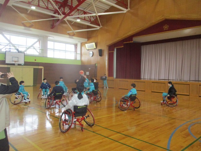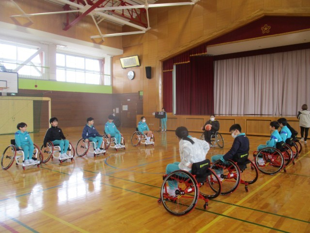市社会福祉協議会の方にお世話いただき、福祉の学習の一環で車いすバスケットボールの体験をしました。実際に車いすバスケットボールをしておられる方に車いすの使い方やルール等を教えていただき、ゲームもしました。ボールの持ち運びやパスがなかなか思うようにできないことを感じながらも、楽しさを感じる貴重な体験となりました。