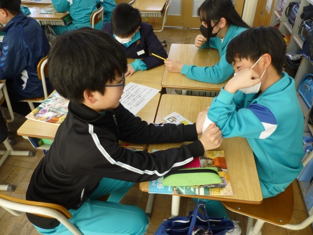 保健学習でけがの手当を学びました。自分でできるけがの手当の仕方について、養護教諭の話から学んだり、実際にけがの場面を想定し、けが人役や手当役になり体験したりしました。学んだことをこれからの生活に役立てていってほしいです。