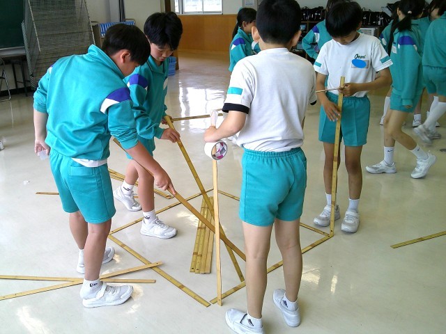 今日は、「1立方メートルはどのくらいの大きさなのか」を調べました。縦横高さがそれぞれ1メートルの立体の体積だということを授業で学び、実際にはどのくらいの大きさなのか量感を養うため、自分たちで竹ものさしを使って作ってみました。