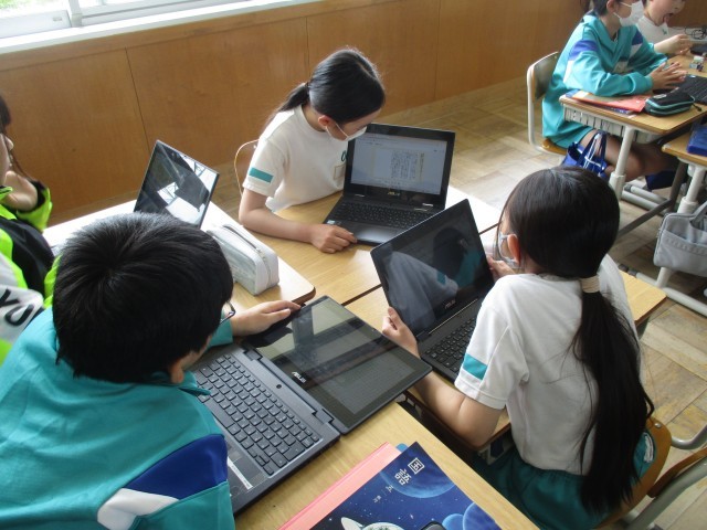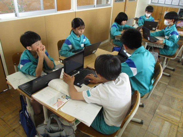 5年生は社会科で、自分たちが住む日本は世界を基準に見ると、どのように表せるのか調べました。子供たちは地球儀を見ながら「陸地よりも海が多いね」「日本は思ったよりも小さいんだね」など、気付いたことを共有していました。