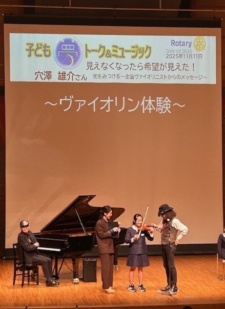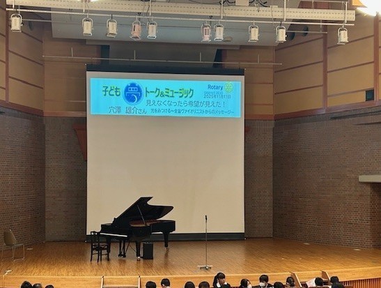 小矢部ロータリークラブ主催の夢プロジェクト「夢トーク&ミュージック」がクロスランドおやべで行われ、6年生全員で参加しました。小矢部ロータリークラブの皆さんが市内の小学校6年生全員を招待してくださる企画です。今年は、全盲のヴァイオリニスト穴澤雄介さんの素敵な演奏とお話を聞きました。自分のしたいこと、できることを見付け、あきらめずに続ける大切さを教えていただきました。各学校の代表児童がヴァイオリンの体験をする場面もありました。最後には、市内の6年生全員の夢がスクリーンに映し出され、充実した時間を過ごすことができました。