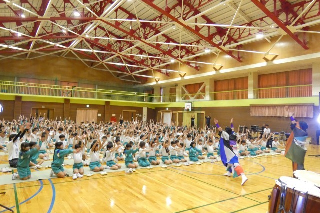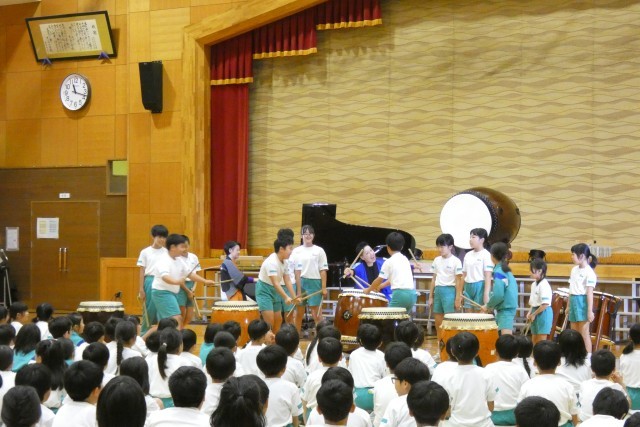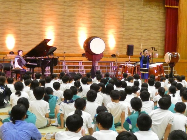 校内芸術鑑賞会を行いました。今年度は、創立60周年を記念した特別な芸術鑑賞会です。小矢部市出身の山本綾乃さんと山本愛香さんによるユニット「ヤマモト万歳」のお二人の演奏を全校で聴きました。和太鼓の力強い響き、ピアノの華麗な音色・・・途中でリコーダーや鍵盤ハーモニカも入れながら様々なバリエーションで繰り広げられる音楽に、子供たちもくぎ付けでした。「大谷小学校校歌」の演奏では、大谷源氏太鼓クラブの子供たちが和太鼓で、その他の子供たちが歌で共演する場面もあり、大いに盛り上がりました。記念の年にふさわしく、聴く人の心に届く素晴らしい演奏でした。