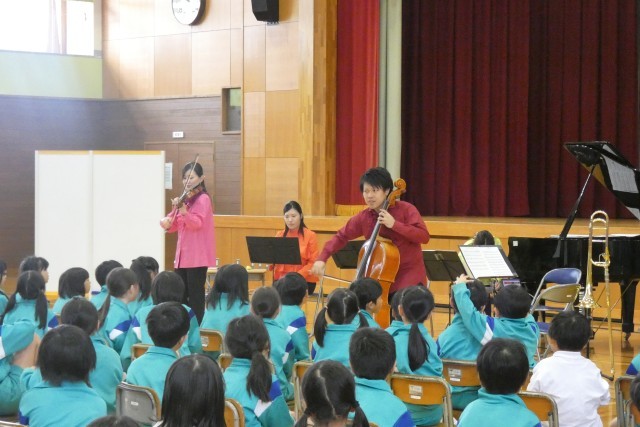 ヴァイオリン・チェロ・フルート・ピアノ・トロンボーンそれぞれの楽器の特色や音色を知り、それらの組み合わせによって豊かな音楽表現ができることを体感しました。