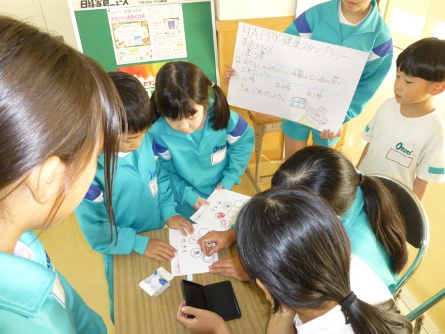 昼休みに保健委員会の子供たちによる「ハッピー健康スタンプラリー」を行いました。委員会活動で、楽しく健康について学べるようにクイズを考えたりスタンプを作ったりして準備していました。今日は1年生の日で、たくさんの子供たちが楽しそうに参加し、スタンプを集めていました。