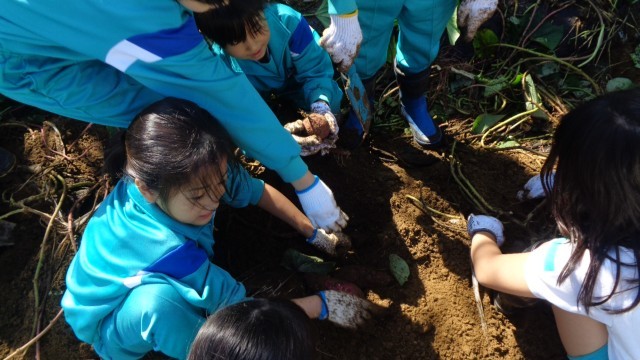 5月に植えたさつまいもを2年生みんなで掘りました。友達と協力しながら取り残しがないように一生懸命掘っていました。大きなさつまいもが収穫でき、秋を感じるよい機会になりました。