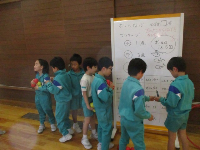 これまで学習してきたボール投げの練習をいかして、得点ゲームをしました。遠くに並んでいるフラフープを狙って工夫して投げ、高得点を取って喜ぶ姿が見られました。