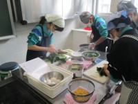 これまで学習した調理実習の経験を生かして、グループごとに考えた献立で調理をしました。使う材料、切り方、味付け等を工夫し、みんなで協力して作りました。自分たちで考えて行う調理実習は、一段と楽しそうでした...