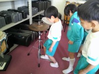 学校探検を行いました。この日は、音楽室で見つけたものを一つ選んで絵をかきました。音を鳴らしてみたり観察したりすることで、新しい発見や疑問をもつ子供の姿が見られました。