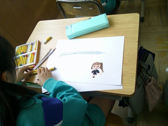 2年生になり初めての図画工作科で、すきなことについての絵をかきました。週末に行った旅行の風景や、スポーツ少年団での様子、休み時間の遊びなど、子どもたちは「大好き」を画用紙いっぱいに広げていました。