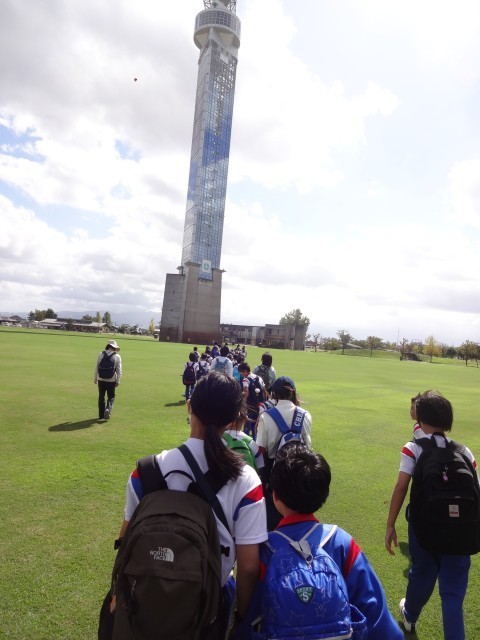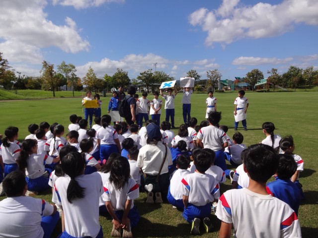 全校で、クロスランドおやべへ出かけました。バスを降りて途中から歩きます。到着後まずは5年生が準備した○✕クイズに挑戦しました。風が強い中、大きな声で進行しました。