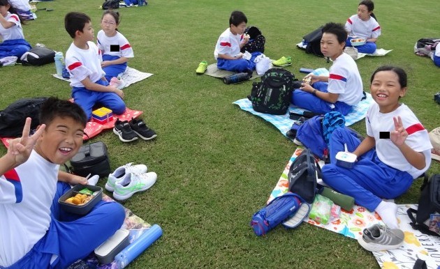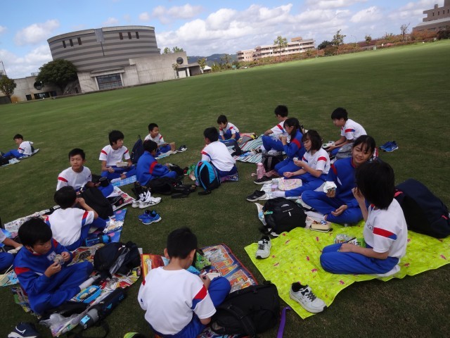 ゲームを楽しんだ後は、お楽しみのお弁当の時間です。グループごとに分かれ学年をこえて仲良く話しながら食べました。昼食後はおやつの見せ合いが始まり、にぎやかな時間となりました。強い風で何度も袋が飛びましたが、走り回って追いかける様子がほほえましかったです。