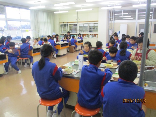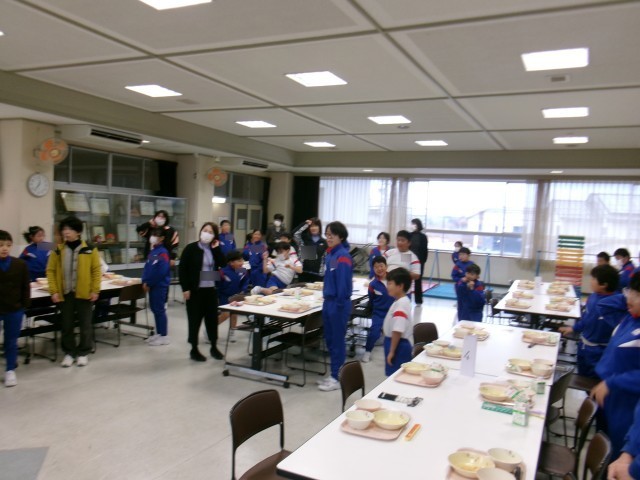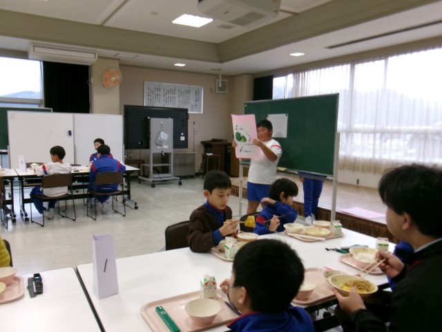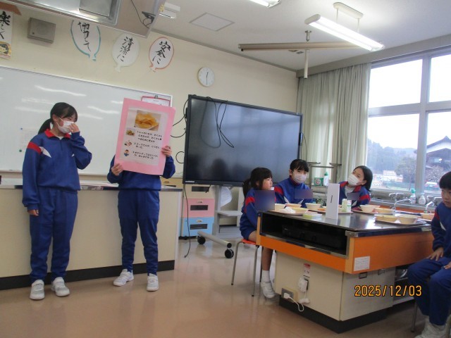 今日は、赤団と白団に分かれ、なかよし会食を行いました。給食・美化委員会が司会やクイズ、じゃんけん大会などをしました。異学年で混ざって食べる給食は、いつもと違う雰囲気の中、楽しく会食ができました。