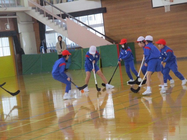 ユニホックの体験を行いました。久しぶりのユニホックだったので、ストックの握り方、ボールの打ち方等を丁寧に教えてもらいました。とても白熱したゲームになりました。また、プレイする子供を「がんばれ」と応援する子供もいました。地元に根付くスポーツを体験できる貴重な時間でした。