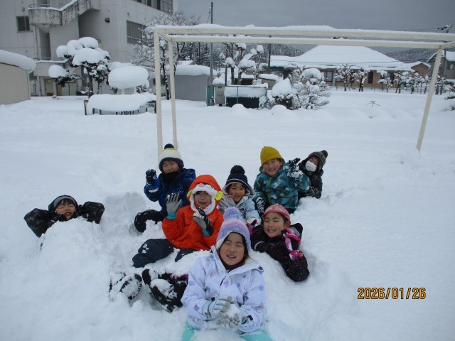 学校のグラウンドに、ものすごい量の雪が積もりました。1年生は、大喜びで、グラウンドに出ました。ふわふわの雪をつかんで上に投げたり、少しだけ雪の中に埋もれてたりして、体全体を使って雪を感じました。さらに、友達と雪だるまを作ったり、そりをしたりして楽しく遊んだりもしました。