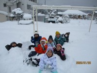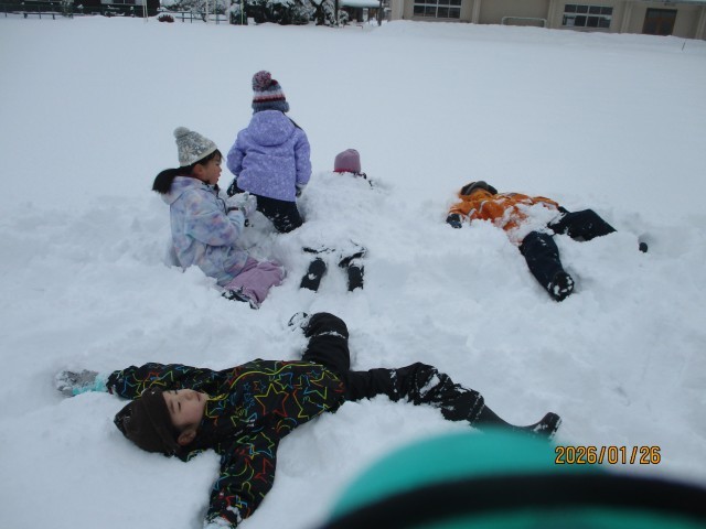 週末に雪がたくさん降ったので、雪遊びをしました。グラウンドの中を一番乗りで遊んだので、雪を自分たちで掘り進めて道を作りました。なかよし山でそりすべりをしたり、雪の中に転がってみたりと、雪とたくさん触れ合いました。