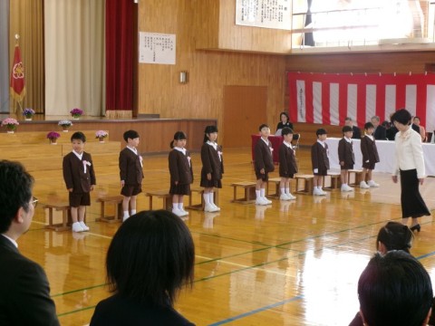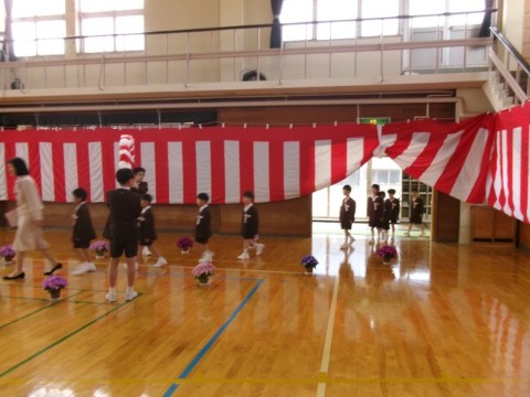 新入児童呼名では、一人一人の元気のよい返事が体育館に響き、その様子を、2年生から6年生の子供たちもにっこり笑顔で見守っていました。