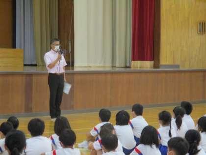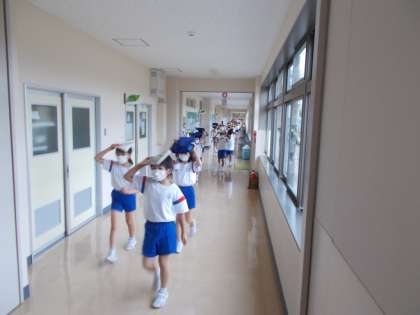避難訓練を行いました。今回は、地震を想定した訓練で、子供たちは自分の頭を守りながら避難しました。地震が起きたらどうすればよいのかを考え、真剣に取り組むことができました。