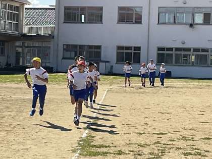 5・6年生は体育で持久走の学習を行っています。今日は、追い抜き方や走るペースをつかむために「追い抜き走」に取り組みました。