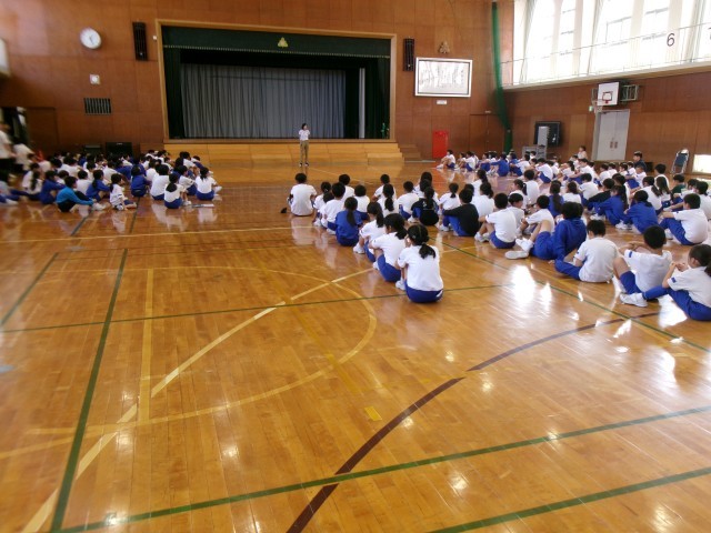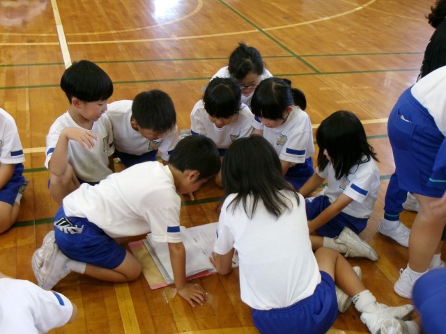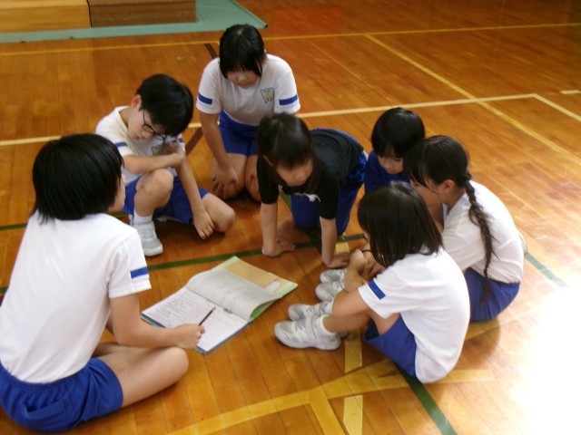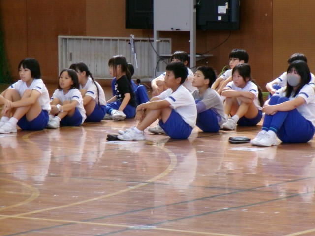 体育館で校外班集会を行いました。担当教員の話を聞いたのち、班ごとに、通学チェックシートをもとに、9月の通学の様子の振り返りました。