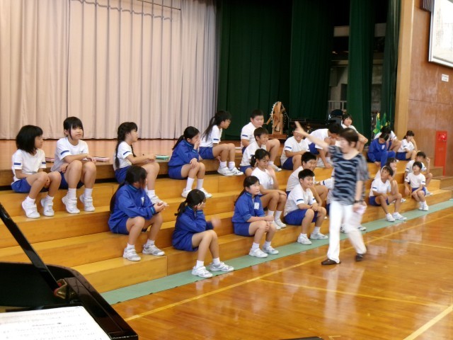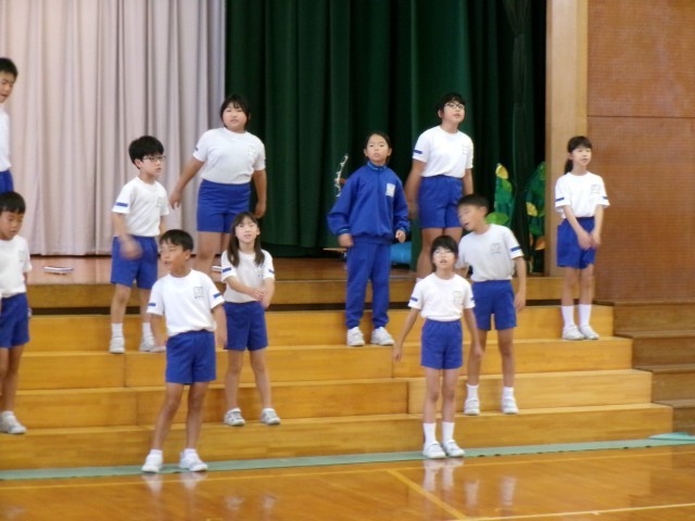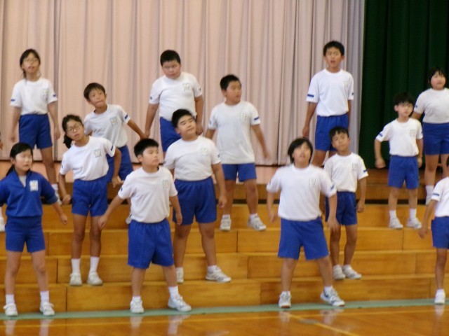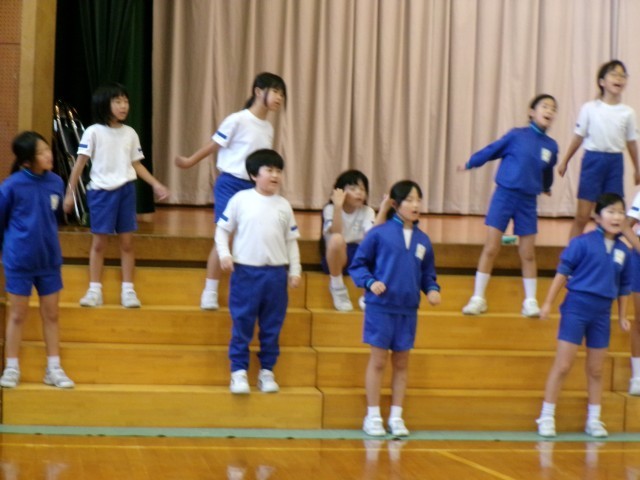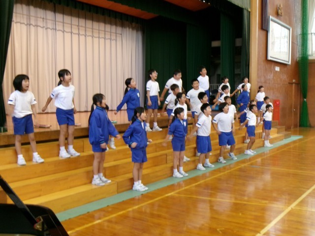 ひな壇に立ち、曲に乗って、口を大きく開けてのびのびと歌っています。