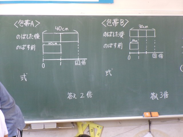 問題「東小学校では、よくのびる包帯を買いたいと考えています。下の包帯Aと包帯Bでは、どちらがよくのびるといえるでしょうか。」