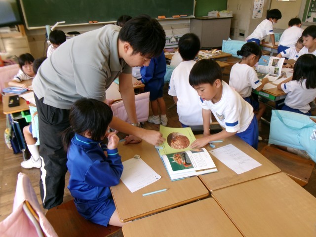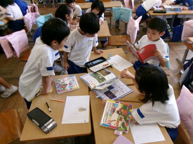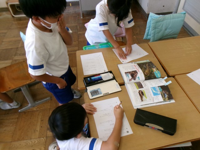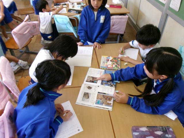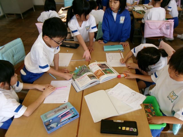 自分が調べたい生物を決めて、図鑑で調べ、ワークシートに書き込みます。友達とも話し合いながら学習を進めます。