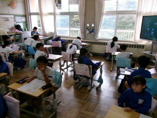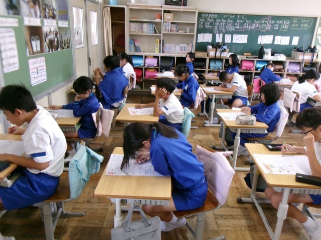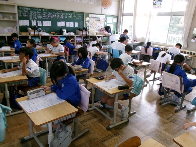 子供たちは、算数のテスト問題に、落ち着いて取り組んでいます。