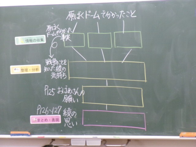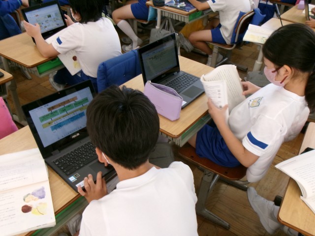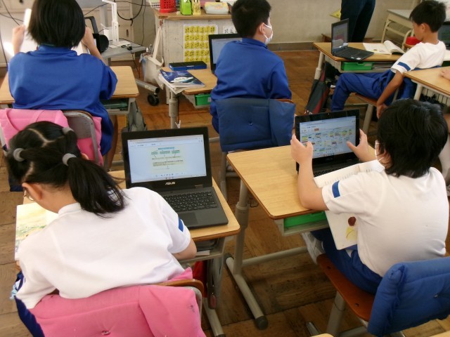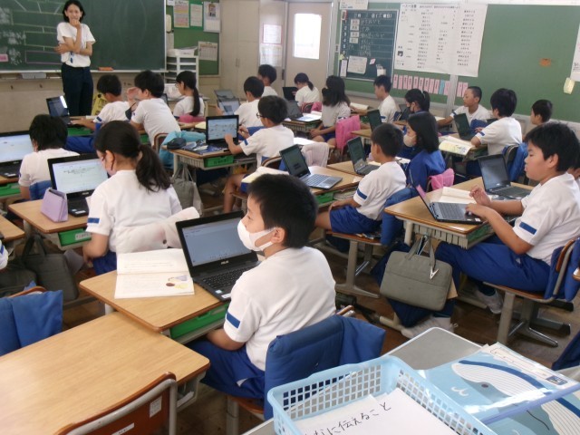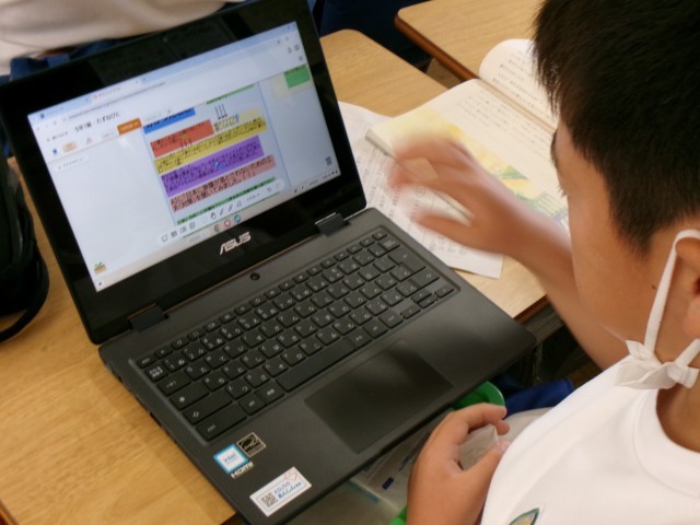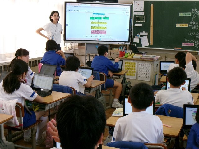 子供たち一人一人が、教科書の本文を読み、タブレットを使って、「情報の収集」「整理・分析」「まとめ・表現」を行います。一人一人の学びを電子黒板で共有し、学びを深めていきます。