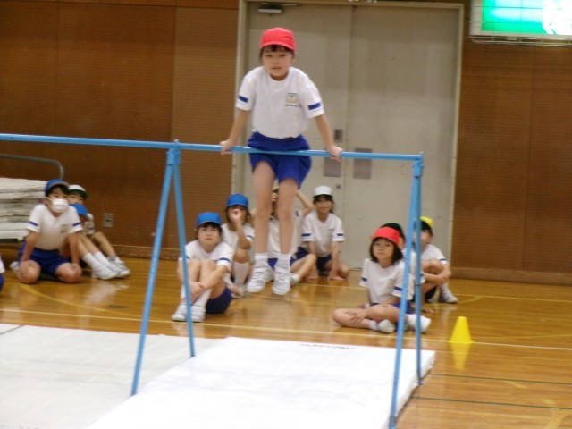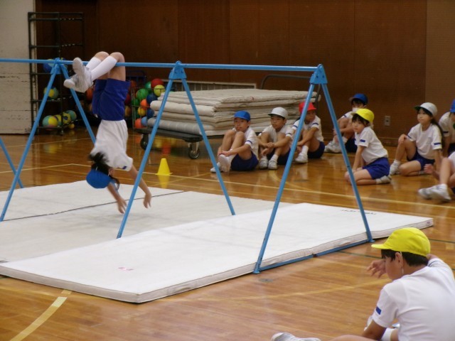鉄棒運動の最終の時間、一人一人が、みんなの前で、自分の技を発表します。発表を終えポーズをとると、拍手を送ります。