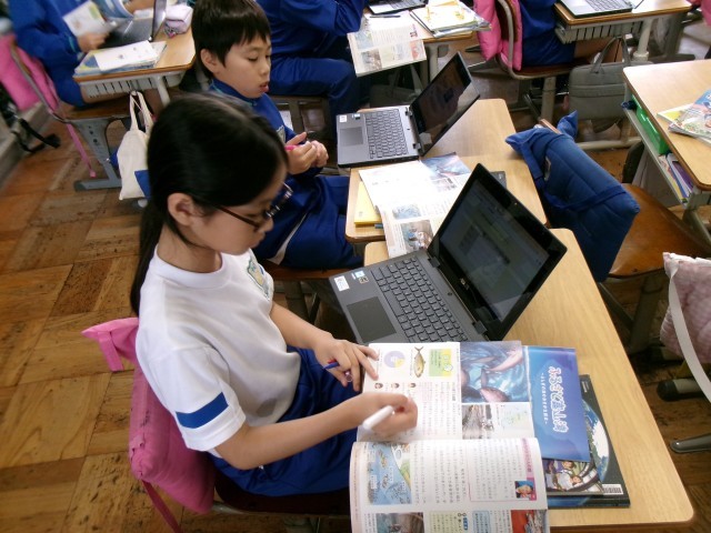 一人一人が、「養しょく」「と「さいばい漁業」について、教科書を読み、「方法」「メリット」「工夫」の視点から情報を収集します。