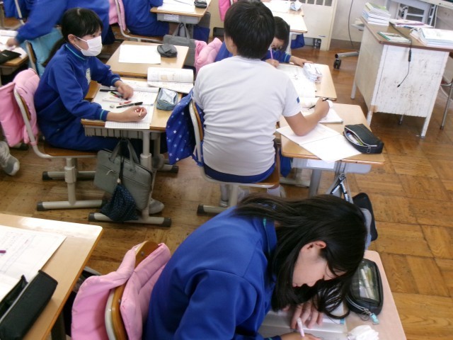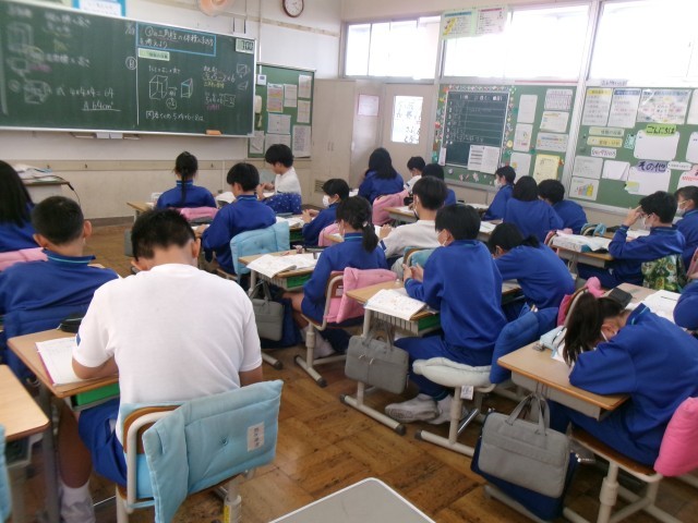 2人の友達がどのように考え体積を求めたのかを、一人一人考え、その説明をノートに書きます。友達と確認し合ったり、先生にヒントをもらったりして進めます。子供たちは、落ち着いて学習に取り組みます。