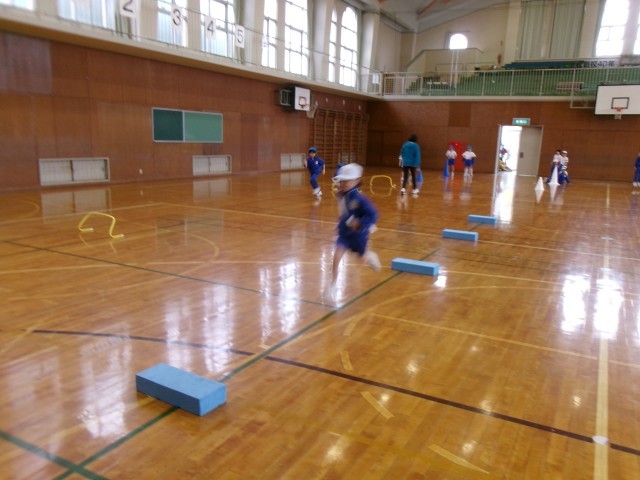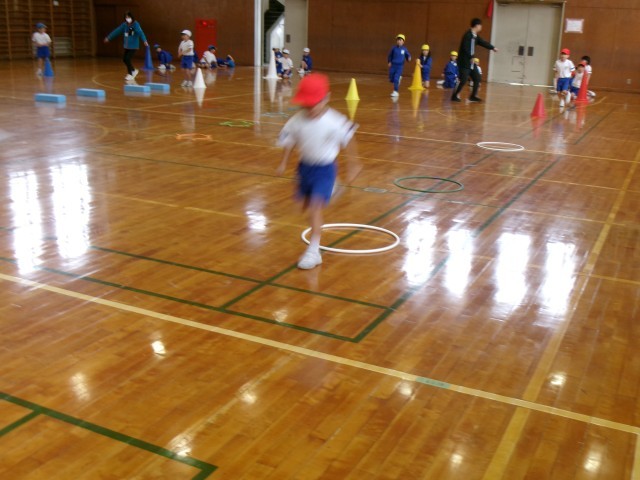 チームごとに、フープやミニハードルなどを並べて、それを跳び越しながら走ります。コーンを回って折り返し、次の仲間にタッチします。2回目は、早く走り抜けることができるように、チームで、フープやミニハードルなどの並べ方も工夫しました。
