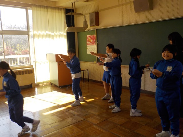 4年生は、理科『閉じ込めた空気と水」の学習です。ビニル袋を膨らませて弾ませたり、注射器に詰めたスポンジを飛ばしたりして空気の性質を考えるきっかけとしました。