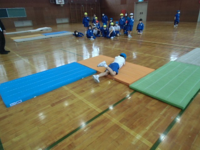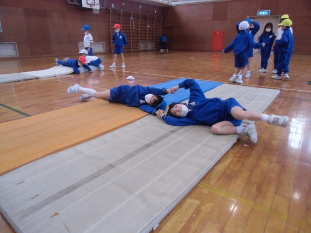 いろいろな形のマットで、自分たちで遊び方を考えました。横転がりを2人で手つないでやってみるときには、息を揃えて転がりました。