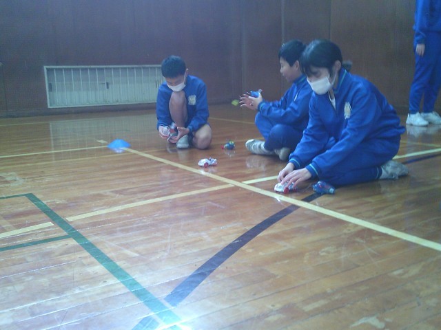6年生は理科の学習で、手回し発電機でつくった電気を利用する学習をしています。今日は体育館で、手回し電気でつくった電気で、車を走らせました。必死に手回し発電機を回して電気をつくりました。車のスイッチを入れると、すごい速さで体育館中を走り、子どもたちはびっくり!ためた電気の力を実感することができました。