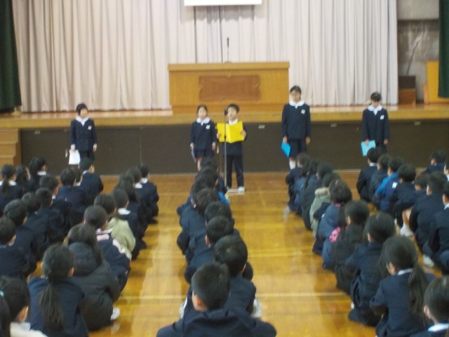 第2学期の終業式がありました。初めに、各学年の代表が2学期に学習や運動、行事等でがんばったことやできたことを発表しました。