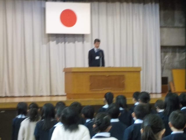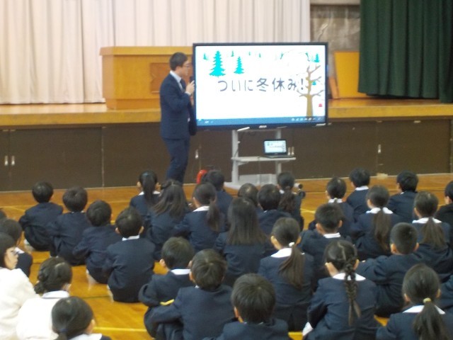 最後に、生徒指導担当から冬休みの過ごし方についての話を聞きました。「挨拶・安全」「いつもの生活」、「(お手伝い等)うれしくなることをする」「衛生」「お金の使い方」に気をつけて過ごすことの大切さを確認しました。3学期の始業式に、元気に登校するみなさんを待っています。
