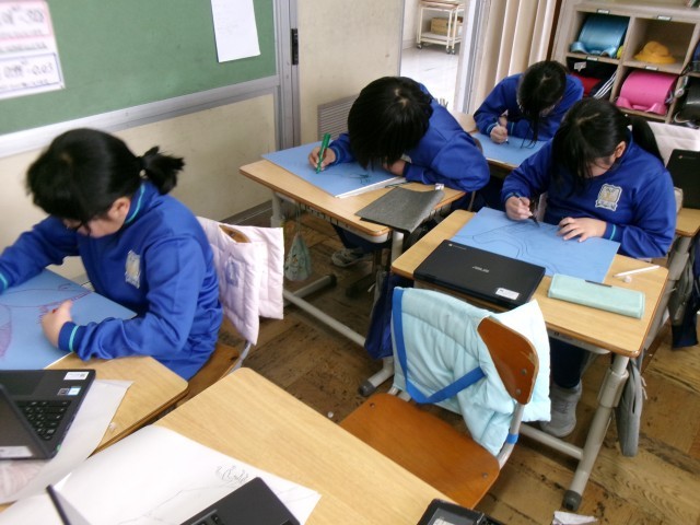 今日は、板に描いた下絵に、彫る太さを考えて、マジックで線の太さの強弱を付けます。