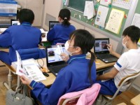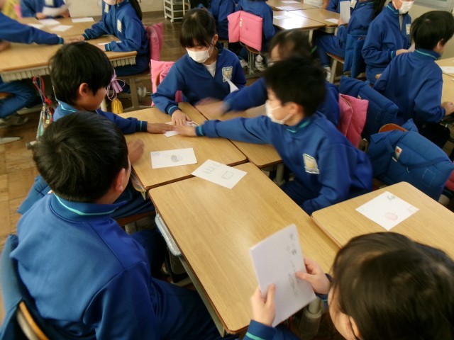 漢字1つを決めて、音読み、訓読みを使ったひとつながりの文を考え、思い思いにかるたを作りました。グループで、作ったかるたで仲よく遊びます。