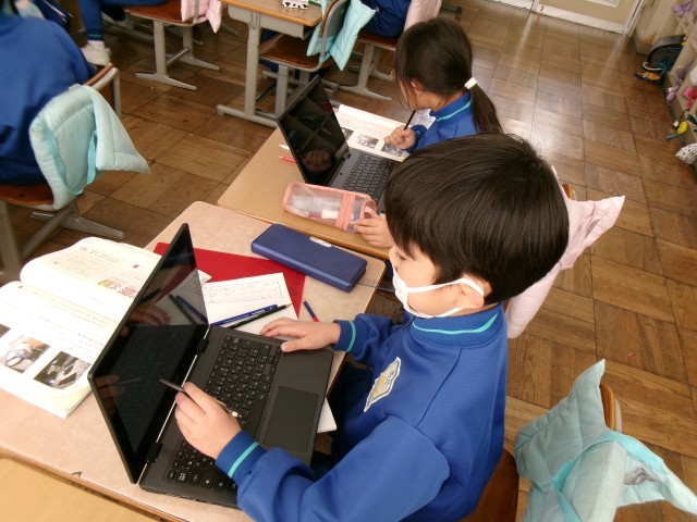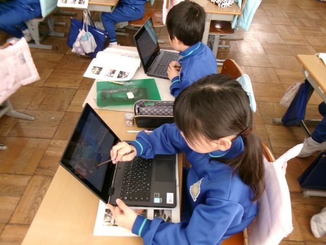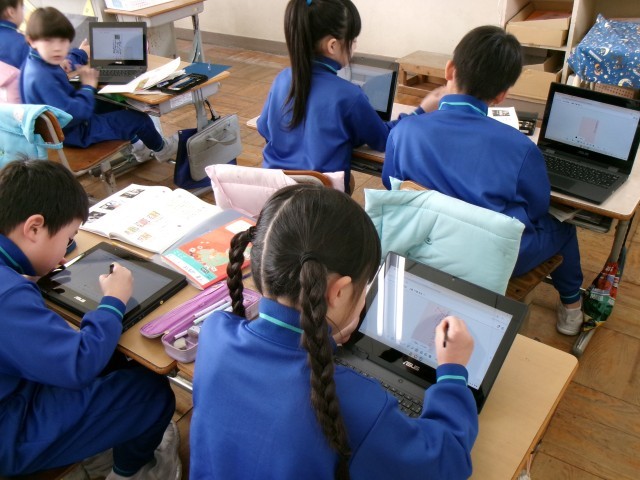 一人一人が、タブレットのワークシートに、タッチペンで書き込んでいきます。