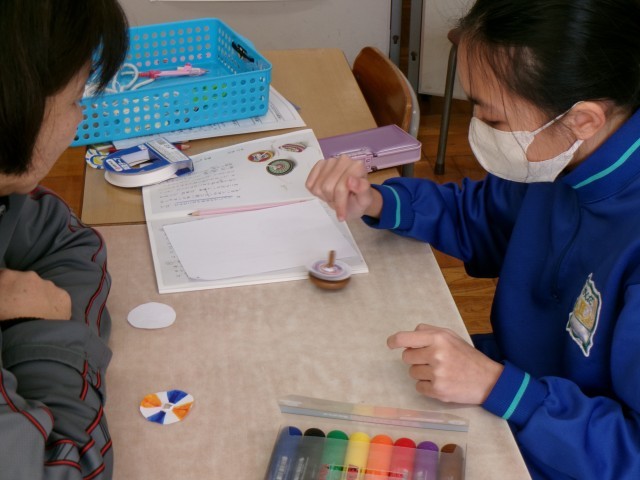 まずはじめに、教科書の教材文を音読します。教材文にあるように、こまを回すとこまの色が「まざりあい、元の色とちがう色にかわる」ことを、自分でこまに色を着け回してみることで理解します。