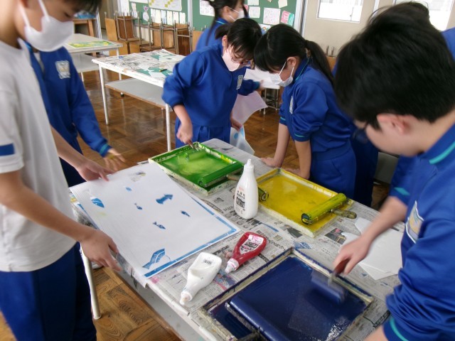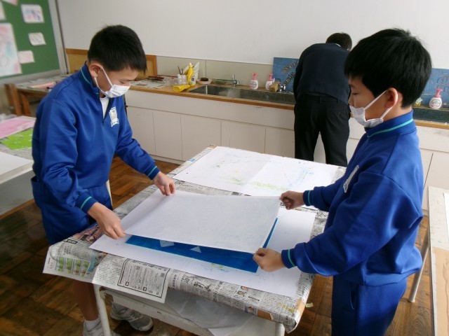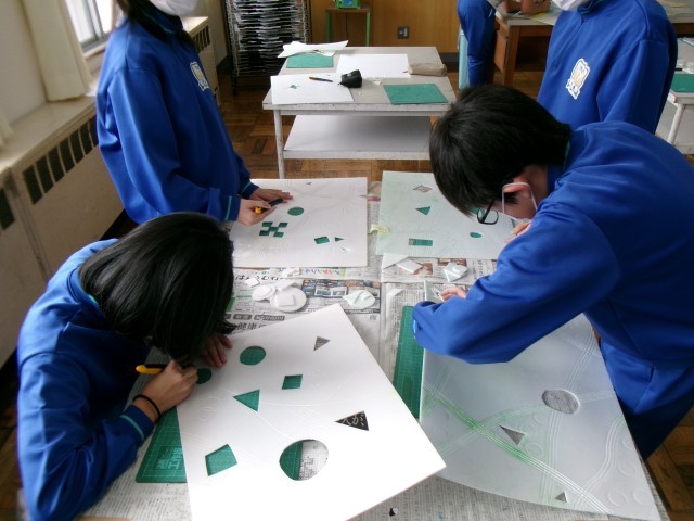 形を切って、思い思いの色を重ねていきます。友達に手伝ってもらい、慎重に重ねて刷ります。