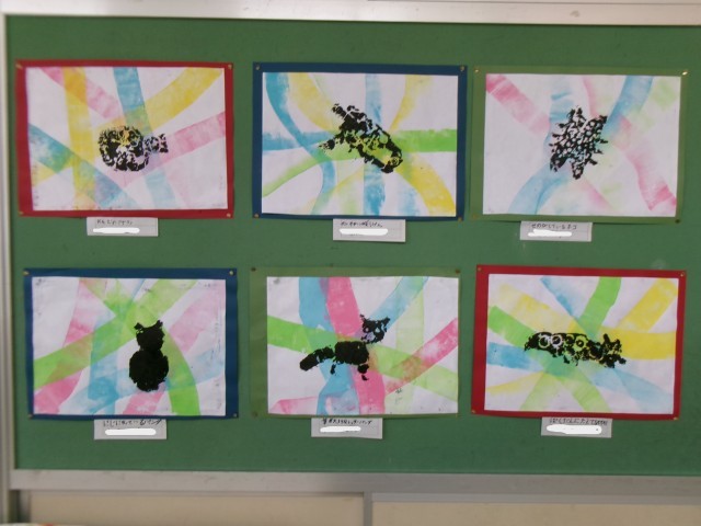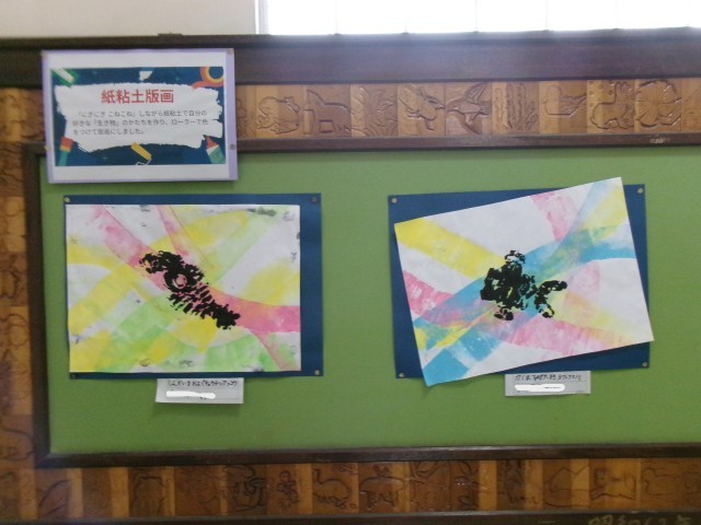 「にぎにぎ こねこね」しながら紙粘土で自分の好きな「生き物」のかたちを作り、ローラーで色をつけて版画にしました。