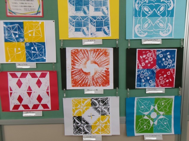 1枚の正方形の板に模様を描き、その板で4回紙に刷り重ねました。出来上がりの模様を想像しながら刷り重ねました。