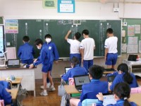 1.2年生の学校探検の様子です。2年生が1年生にどんなことをする教室か説明しながら仲よく学校を回りました。また、教室前にはスタンプが置いてあり、行った場所のスタンプを満足そうな表情で押していました。