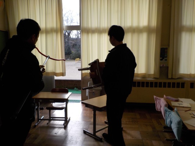 子供たちは、半日入学で園児にプレゼントするメダルを作っています。小学校の様子の絵...
