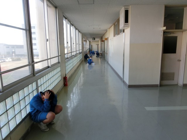 まず、子供たちは、放送に合わせて、その場で身を守る行動をとります。次に、避難方法の指示に従い、近くの集合場所へ移動します。事前練習はここまでです。
