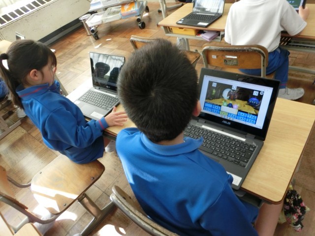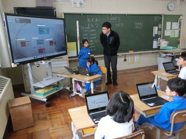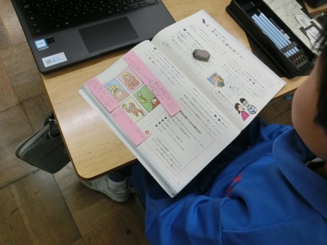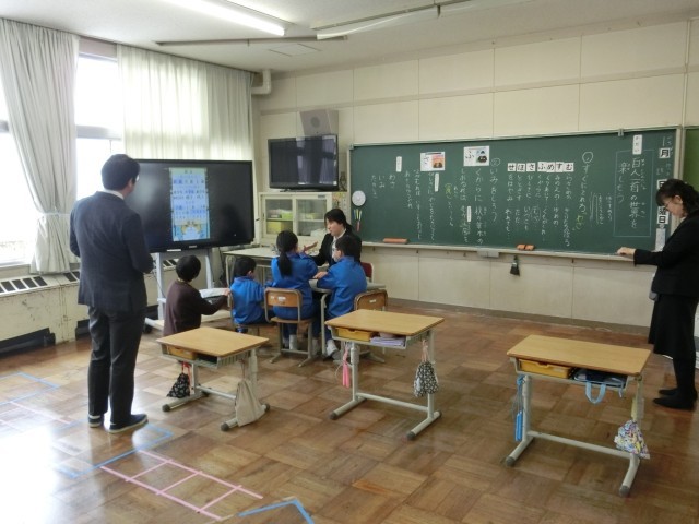 3年生は、国語科で、4つの挿絵を使った物語づくりの学習です。挿絵が表すことを読み取り、「始め、中、終わり」の物語を三人グループで共同編集に取り組んでいました。