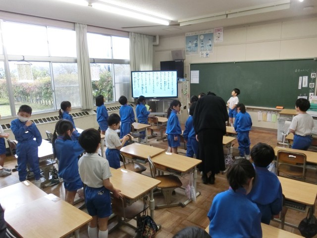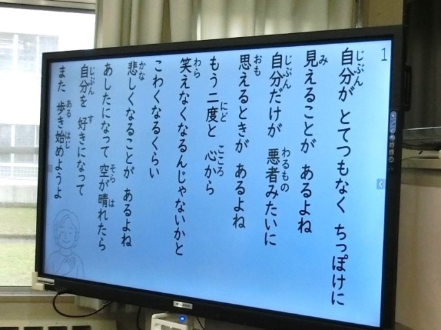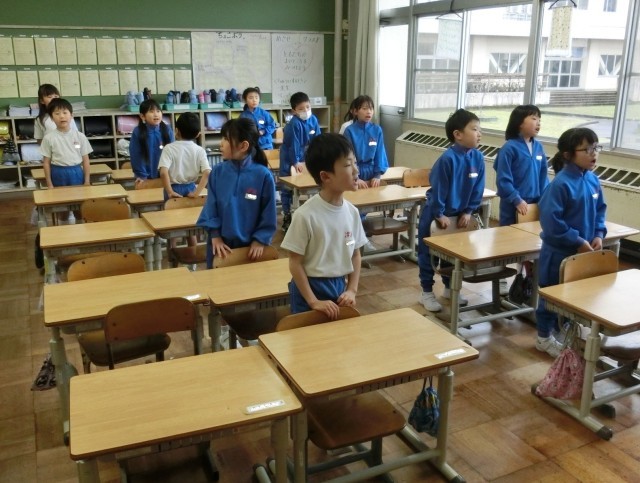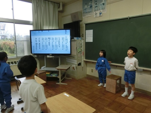朝の会では、「今月の歌」を歌っています。1年教室をのぞいてみると、子供たちが大きな声で歌っていました。