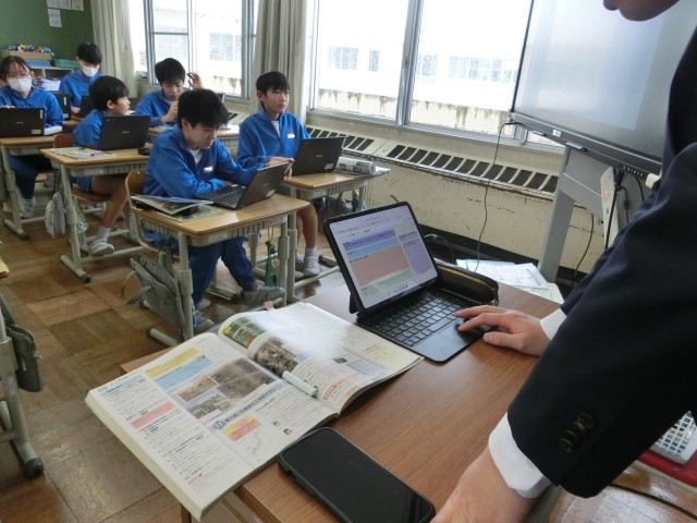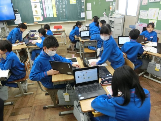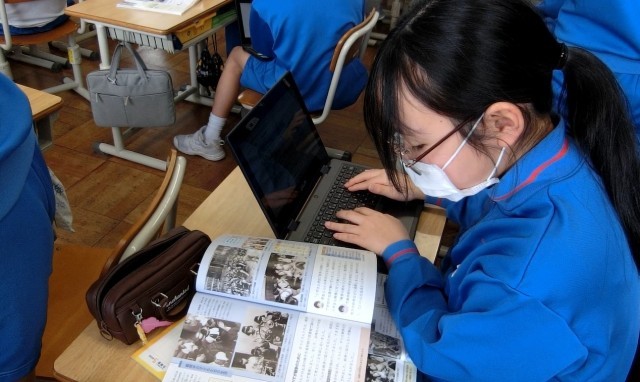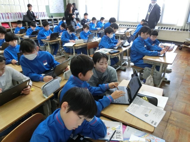 6年生は、社会科の学習で、戦時中の暮らしについて調べていました。衣・食・住の三つの視点を基に、教科書を読み取って、クラウドツールにまとめていました。教員は、子供たちの学びの様子を確認し、個別指導をしています。 -